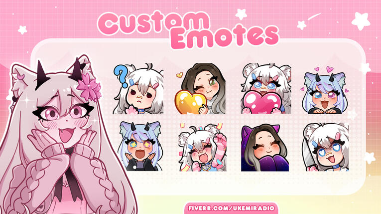 I will help you create cute anime style custom Emotes/Badges/Alerts for your Twitch Channel <3Please follow these steps:1. Message me and tell me your requirements, provide reference photos, images and so on
