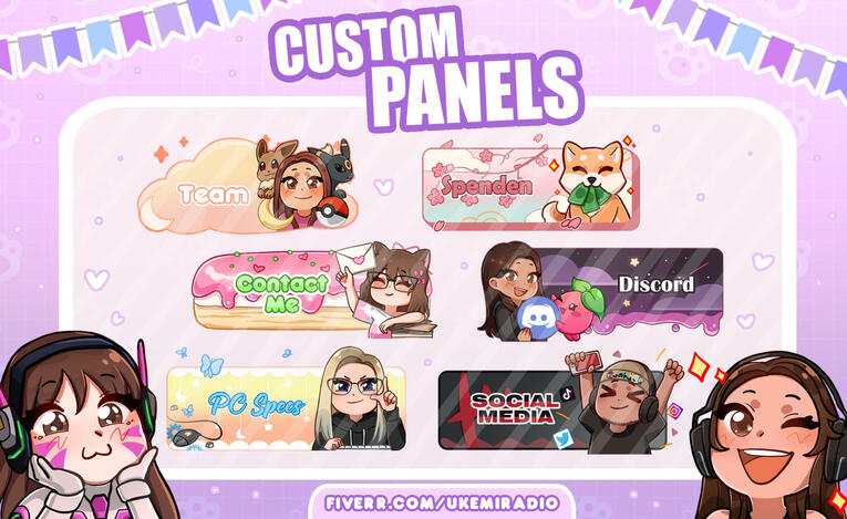 I will help you create cute anime style custom Panels for your Twitch Channel <3Please follow these steps:1. Message me and tell me your requirements, provide reference photos, images and so on